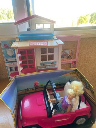 Casa y coche Barbie en muy muy buen estado. El coche no se ha llegado a usar, está sin sacar de la caja. Va con una muñeca Barbie de regalo.