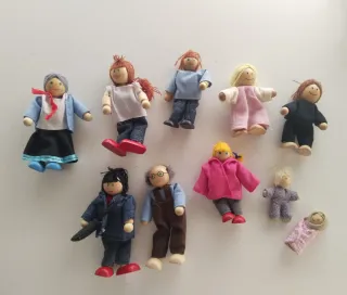 Conjunto de muñecos de madera para casa de muñecas. - Incluye 9 figuras. - Diseños variados para crear familias. - Material: Madera y tela.