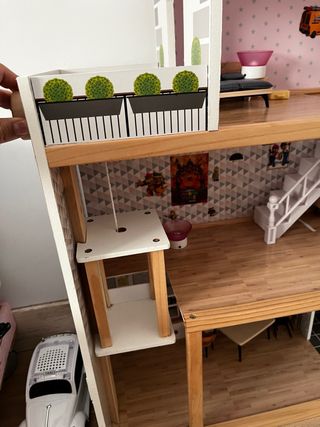 Casa de muñecas de madera con varios niveles y detalles. - Balcones con plantas decorativas. - Escaleras interiores. - Paredes con diseños. - Muebles y accesorios incluidos. - Ascensor