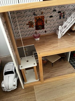 Casa de muñecas de madera de varios pisos, ideal para horas de juego. Mide 1,35x1,30 - Múltiples habitaciones y accesorios incluidos - Diseño detallado y colorido. - Estructura de madera resistente. Montada tiene hasta ascensor. Genial para muñecas tipo Barbie . Solo recogida se encuentra en Las Labores También se puede llevar a Villarrubia de los ojos y alrededores