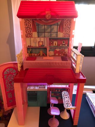 Casa de muñecas Barbie de dos pisos con accesorios. - Color rosa y rojo. - Incluye cocina y habitaciones. - Puerta lateral. - Muebles y accesorios.