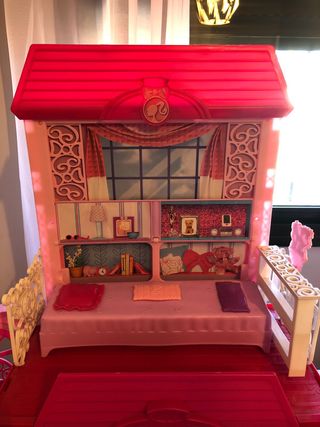 Preciosa casita de juguete para muñecas con asa para su transporte e ideal para jugar. Se encuentra en muy buen estado. - Incluye pizarra, pupitre, sillas y otros accesorios. - Diseño de casa con dos plantas. - Perfecta para estimular la imaginación. Dimensiones: - alto: 36 cm -ancho: 36 cm - ancho: 14 cm No se incluye 3 pilas de botón para el timbre y pequeña luz interior.