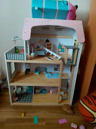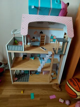 Fantástica casa de muñecas de madera, lista para horas de juego. - La casa tiene signos del uso como desgaste y abombamiento en el suelo y una de las columnas de la madera se ha roto. - Incluye una gran variedad de mobiliario. - Diseño detallado y colorido. - 3 pisos - Sólo por la gran cantidad de mobiliario ya merece la pena - No se incluyen las muñecas