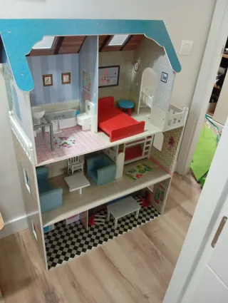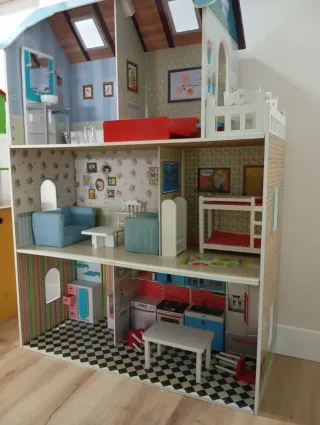 Casa de muñecas de madera de varios pisos, ideal para horas de juego. - Diseño detallado con múltiples habitaciones. - Incluye mobiliario y accesorios. - Estructura resistente y segura.