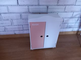 Armario de madera para muñecas Mimittos de la casa juguettos en perfecto estado como nuevo. Ideal para guardar y organizar los vestidos y accesorios de tus muñecas. - Color rosa y blanco. - Dos puertas. - Diseño bonito y elegante. - Pequeño y práctico - Percheros.