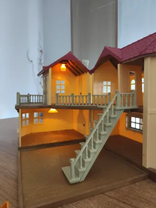 Casa de muñecas Sylvanian Families con varios niveles y accesorios. - Incluye muebles como bañera, cuna y armario. - Escaleras de acceso entre pisos. - Diseño de casa de dos plantas con tejado rojo. Casa con algun mobiliario como se vé en las fotos.