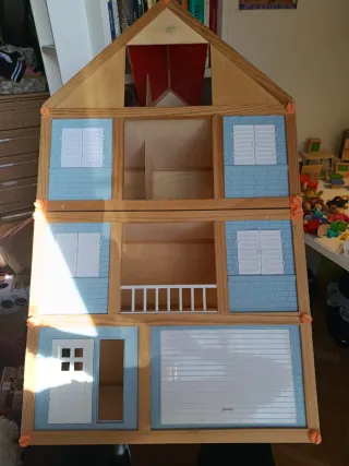 Casa de muñecas de madera con varios niveles y habitaciones. - Estructura de madera. - Fachada con detalles de ladrillo azul. - Ventanas blancas con contraventanas. - Puerta principal y puerta de garaje. - Balcón interior. Muchos muebles para cocina, salón, dormitorio, baños ..muñecos etc.