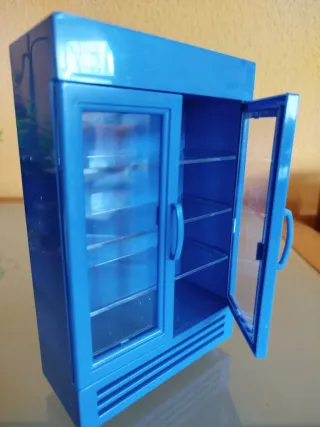 Frigorífico expositor de dos puertas en miniatura. Ideal para coleccionistas o casas de muñecas (Los accesorios que aparecen dentro del frigorífico no están incluidos) - Diseño de doble puerta. - Estantes interiores visibles. - Material: Plástico - Medida: Largo 11,1 cms / Alto 17,6 cms / Fondo 5 cms