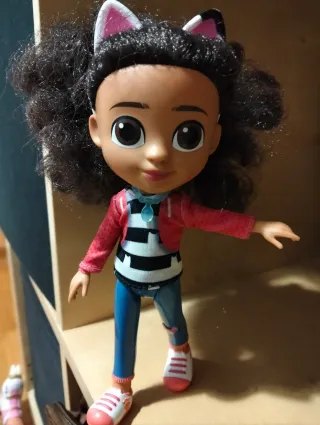Muñeca de la serie Casa de Muñecas de Gabby. - Incluye diadema con orejas de gato. - Vestido a rayas blancas y negras. - Chaqueta rosa. - Pantalones vaqueros azules. - Zapatillas deportivas rosas y blancas.