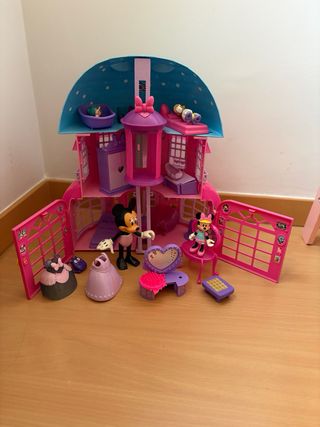 Divertida casa de muñecas de Minnie Mouse con múltiples niveles y accesorios. - Incluye figuras de Minnie y Mickey. - Cuenta con un ascensor funcional. - Incluye accesorios como vestidos, tocador y silla. - Diseño colorido y atractivo.