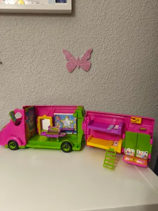 Divertida casa de muñecas Pinypon con forma de caravana. - Color rosa y verde. - Diseño de mariposa en la pared.