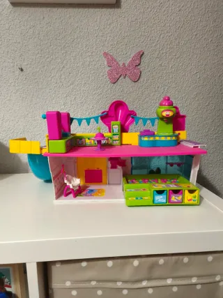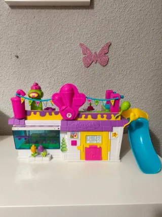 Divertida casa de muñecas Pinypon con temática de heladería y tobogán. - Incluye accesorios. - Colores vibrantes: rosa, morado, amarillo y azul. - Diseño detallado con ventanas y puertas. - Banderines decorativos.