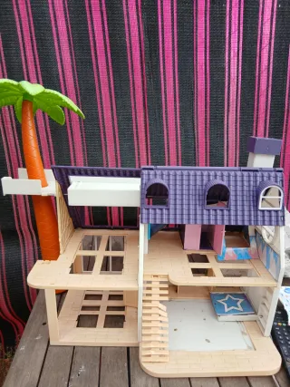 Casa de muñecas Mymy City con palmera. - Diseño de tres plantas. - Techo morado con detalles. - Escaleras interiores.
