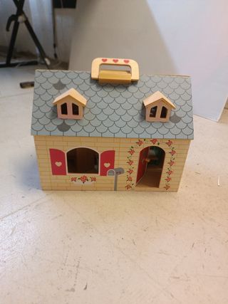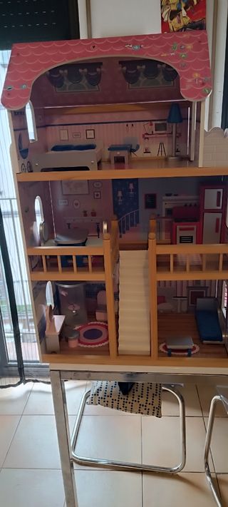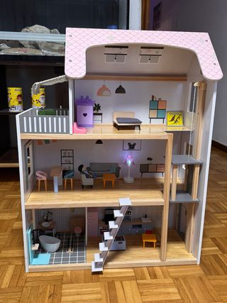 Casita de muñecas de madera con varios niveles y muebles. - Estructura de madera clara. - Incluye accesorios de mobiliario para diferentes estancias. - Diseño abierto para fácil acceso a las habitaciones. - incluye familia de muñecos y muñecas de tamaño adecuado. - la casa tiene trasera y agujeros para colgarla. - en buen estado. Solo tiene algunos agujeros mas que se ven claramente en las fotos.