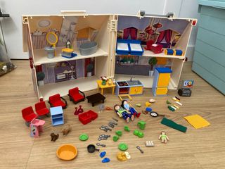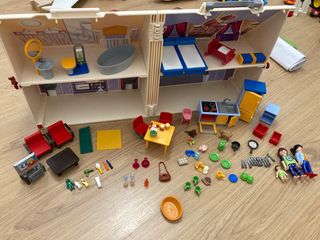 Maravillosa casa de muñecas de madera, con sus meubles, accesorios y simpátocos inquilinos. Tener una casa de muñecas en casa potencia la imaginación y la creatividad, enseña a los pequeños valores y actitudes que se trasladan a la vida real, sobre como mantener una vivienda en harmonía, sobre convivencia... Además esta casa posee un techo amovible para facil acceso al piso de arriba. Las escaleras y el balcón se pueden cambiar de lugar, dando a lugar a distintas configuraciones arquitectónicas. Atencion: los personajes, el pie de las lámparas de noche y la escalera de las literas estan un poco dañados por el uso.