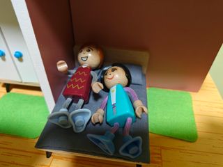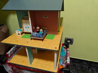Casa de muñecos de madera en perfecto estado con sus accesorios y 3 muñecos articulables.