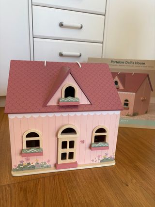 Preciosa casa de muñecas de madera de la marca Little Dutch. Ideal para horas de juego. - Techo y paredes en tonos rosados. - Ventanas y puerta de madera. - Decoración floral en la base. En su embalaje original. Le falta una sillita que no la encuentro, el resto está todo.