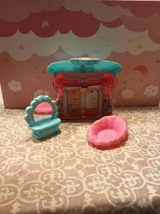 Conjunto de casa de sirena Pin y Pon con accesorios. - Casa de color rosa y azul con detalles. - Incluye un espejo decorado. - Viene con un asiento o cuna rosa.
