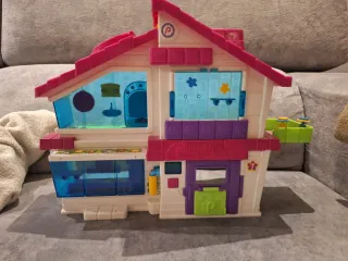 Casa de juguete Pin y Pon con varios niveles y accesorios. - Incluye jardín exterior. - Cocina equipada en la planta baja. - Baño y habitaciones en la planta superior. - Techo decorado con detalles. - Ventanas y puertas de colores vivos.