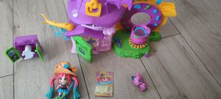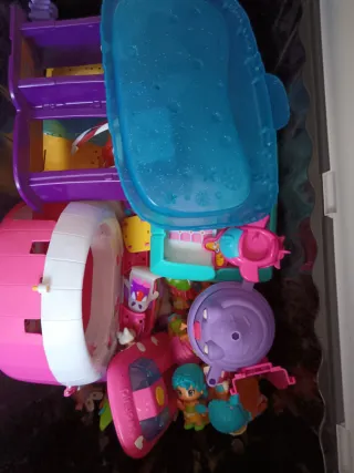 Se vende pack de Pin y Pon que incluye 14 muñecas, puesto de dulces, mini casa de sirena, una moto y múltiples mini accesorios - Casa de color rosa y turquesa con puerta. - Moto de color rojo con caja. - Figuras de Pin y Pon.