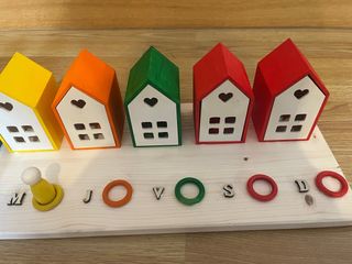 Juego de casitas de madera estilo Montessori, ideal para el desarrollo infantil. - Incluye casitas de colores: amarillo, naranja, verde y rojo. ( personalizables) - Cada casita tiene un diseño con ventanas y un corazón. - Viene con un muñeco y aros de colores para encajar.