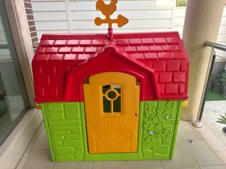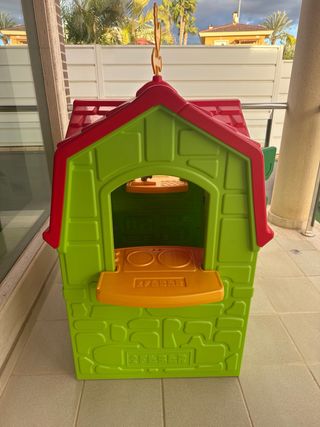 Casita de juguete de plástico para niños, con techo rojo y paredes amarillas y verdes. Tiene ventanas y una puerta. - Diseño colorido. - Material de plástico resistente. La puerta la tenemos, un enganche esta reparado