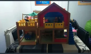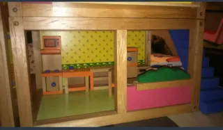 Casita de muñecas única, hecha a mano con mucho amor por el abuelo. Los niños se han hecho mayores y con mucha pena vamos a venderla. - Tres plantas. - Terraza. - Múltiples habitaciones amuebladas. - La mayoría del mobiliario hecho a mano. - Cocina hecha a mano. - Incluye accesorios decorativos. No incluye las mesas y sillas rojas y amarillas de la última foto. No la envío. Hay que recogerla. Tiene algún papel pintado levantado, pero se puede renovar fácilmente.