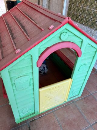 Casita de juguete de plástico para niños. - Color verde con techo rojo y puerta amarilla. - Diseño con detalles decorativos. - Ideal para exteriores.
