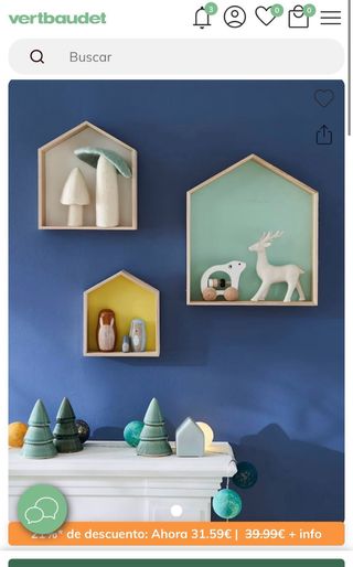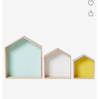 Conjunto de tres estantes decorativos con forma de casita, de la marca Verbaudet. Perfectos para añadir un toque original a cualquier habitación. - Estructura de madera. - Uno con interior en color menta. - Otro con interior en blanco. - El más pequeño con interior en amarillo.