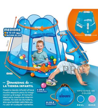Casita de juegos plegable de la marca Its Magical. Ideal para que los más pequeños se diviertan. - Diseño redondo con borde decorado. - Asa para facilitar su transporte. - Colores vibrantes: azul turquesa, naranja y amarillo.