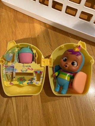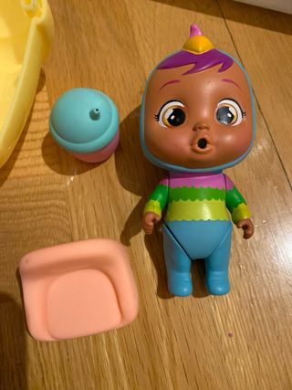 Set de muñeca Bebé Llorón con su casita y accesorios. - Muñeca con traje de rayas y detalles azules. - Casita amarilla con compartimentos. - Incluye biberón y otro accesorio. - Diseño colorido y divertido. A recoger en Madrid