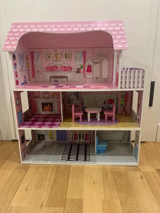 Casita de muñecas de madera con varios niveles y accesorios. - Incluye cama, tocador, sofás y sillas. - Decoración interior con papel pintado. - Ideal para juegos de imaginación.
