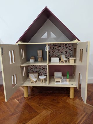Casita de muñecas de madera de la marca Janod. Está en condiciones perfectas porque mi hija nunca ha jugado con ella. Debe ser una de las pocas niñas del mundo a quien no le gusta jugar con muñecas, barbies o casitas, así que como ocupa mucho espacio, es mejor que pase a manos de niñ@s que le den uso y la disfruten. Cuando le he dicho que la íbamos a vender me ha dicho “voy a jugar con ella, ¡no la vendas por favoooor! y yo le he dicho “demasiado tarde, beibi” 😂