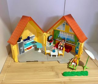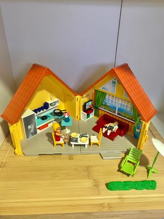 Preciosa casita Playmobil con forma de maletín. Ideal para jugar en cualquier lugar. - Se abre por la mitad para facilitar el juego. - Incluye dos plantas. - Diseño colorido y atractivo. - Perfecto estado de conservación.