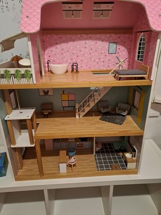 Preciosa casita de muñecas Amanda and family. Es de madera y tiene tres pisos. Medidas : 122cm de alto, 85cm de ancha y 36cm de fondo. - Incluye muebles, accesorios y muñecas (baño, salón, cocina, dormitorios,etc) - Está en buen estado, lista para jugar (algunos roces pero muy leves) - Algunos muebles no son de la casa (los hemos comprado a parte) y están un pelín amarillos porque son antiguos, pero en buen estado. Los muñequitos también están incluidos. Se aceptan ofertas razonables. #navidad #regalo #Reyes #niño #niña #juguete #imaginacion #jugar #muñecas #juguete