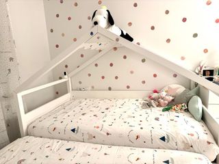 Preciosa cama infantil con forma de casita, ideal para crear un espacio de juego y descanso único para los más pequeños. Está en muy buen estado (precio nuevo 450€). - Medidas: 90x190 cm. - Estructura de madera. - Diseño tipo casita/cabaña. Colchón no incluido.