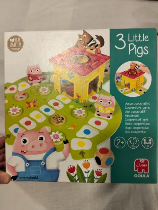 Juego cooperativo Los 3 Cerditos de Goula. Ideal para los más pequeños. - Incluye tablero, casita, figuras de cerditos y lobo. - Fomenta el juego en equipo y la resolución de problemas. - Diseñado para niños a partir de 2 años.