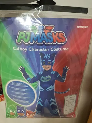 Disfraz de Gatuno de la popular serie PJ Masks. Producto oficial. Perfecto para fiestas de disfraces o para jugar. Talla 5/6 años Las gomas de los pies están sueltas, como muestro en las fotos. - Mono completo con cola. - Máscara para la cabeza. - Guantes.