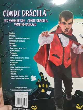 Disfraz de Conde Drácula para niño, perfecto para fiestas de disfraces o Halloween. Incluye capa, camisa con chaleco, jabot y pantalón. Usado una única vez. Como nuevo. - Talla (5-7 años). - Diseño inspirado en Drácula. - Ideal para eventos temáticos.