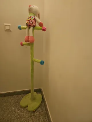 Perchero de pie con un divertido diseño para niños. Incluye un peluche de conejo. - Estructura verde con ramas. - Puntas de colores (rosa y azul). - Base ancha y estable.