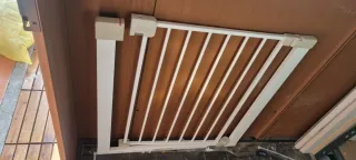Barrera de seguridad de metal blanco, ideal para puertas o escaleras. 5€ debido a que le falta los 4 topes de las esquinas que hacen fuerza en el marcó de la puerta - Estructura de metal. - Color blanco.