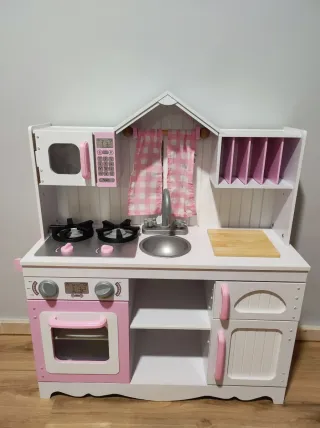 Cocinita infantil de madera estilo Modern Country. - Diseño blanco y rosa. - Incluye horno, fogones, fregadero y microondas. - Con cortinas a cuadros. - Recomendada para niños a partir de 3 años.