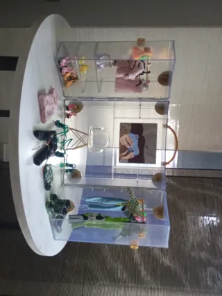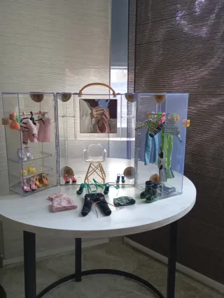 Armario expositor para muñecas o accesorios. - Diseño transparente. - Estructura de plástico. - Ideal para colecciones. Está como nuevo,lo vendo con la ropita y el calzado q se ve en la foto Mide 31x26x21