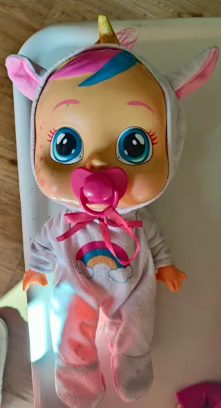 Muñeco bebé llorón con temática de unicornio. Se encuentra en perfecto estado. - Incluye pijama de unicornio. - Viene con su chupete rosa.