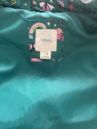Impermeable para niña con un alegre diseño. Talla 7-8 años. Como nuevo, poco uso. - Forro interior a rayas. - Cierre de botones a presión. - Capucha integrada.