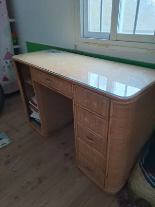 Escritorio de mimbre - Estructura de mimbre. - Un cajón superior. - Cinco cajones laterales. - Estantes abiertos en el lateral izquierdo. - Cubierta de cristal. - Le falta un tirador - Medidas 121 cm de ancho 79,5 cm de altura con cristal 48 cm de profundidad Juguetero con baúl - Estructura de mimbre - Medidas exteriores del baúl 81cm x 38 x32 - En perfecto estado - Medidas 87cm x 76cm x 39,5cm Mesita de noche - De mimbre - Cubierta de crital - 3 cajones muy amplios - Medidas 52cm x 54,5cm con cristal x 32cm Estantería de mimbre - 5 estantes, 2 de ellos con cristal - Medidas 70cm x 180cm x 48c