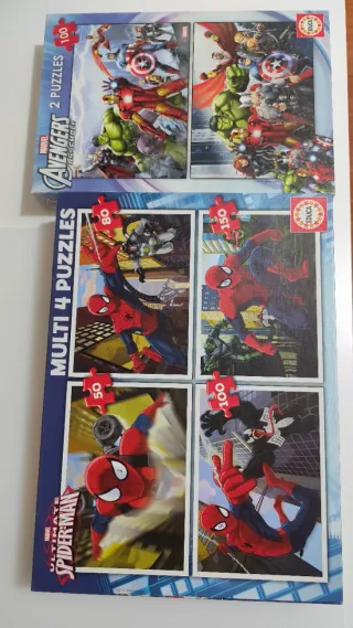 Pack de puzzles de superhéroes de Marvel + Regalo de 3 puzzles Disney - Incluye 2 puzzles de Los Vengadores (Avengers) de 100 piezas cada uno. - Incluye 4 puzzles de Spiderman (Spider-Man) con 50, 80, 100 y 150 piezas. - Marca Educa.