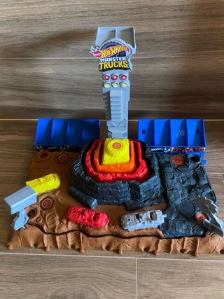 Pista de juego Hot Wheels Monster Trucks con temática de volcán y autos. - Incluye rampa de lanzamiento. - Diseñada para autos y camiones monstruo. - Elementos de juego que simulan un volcán. - Incluye varios autos pequeños.