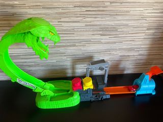 Divertido circuito de coches Hot Wheels con temática de cobra. - Diseño llamativo en color verde. - Incluye varios tramos de pista y accesorios.