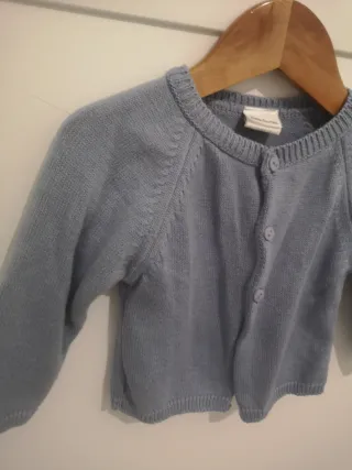 Preciosa rebeca de punto en color azul claro de la prestigiosa marca española Doña Carmen. Ideal para entretiempo o para combinar con ranitas y conjuntos de vestir. Tiene un diseño clásico con manga raglán y cierre frontal de tres botones. Está en perfecto estado, muy cuidada y sin bolitas.